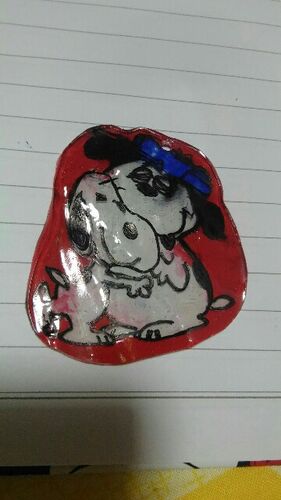 色付けが、難しい。なかなか、思うとおりに、キレイにいかないもんですね。ずいぶん、絵の具を、触っていなかったので、感が、鈍ってます。スヌーピーの顔が歪んで、おかしなことになってます。
